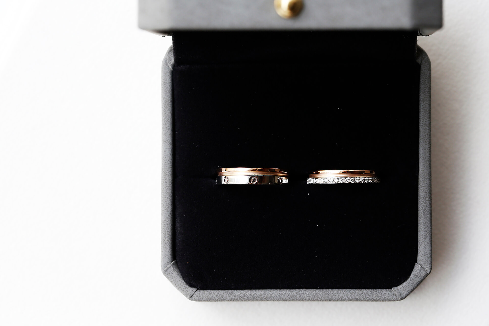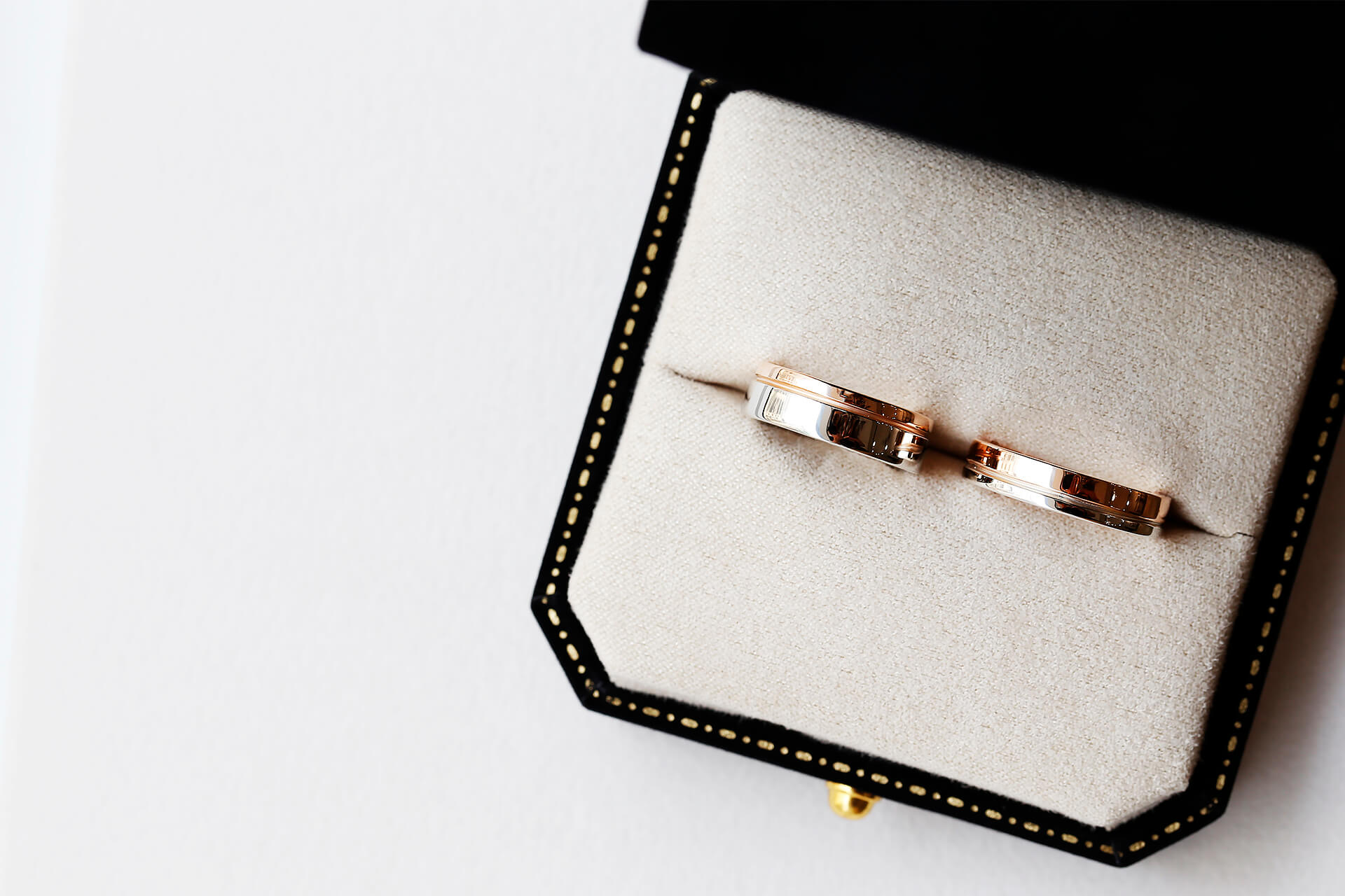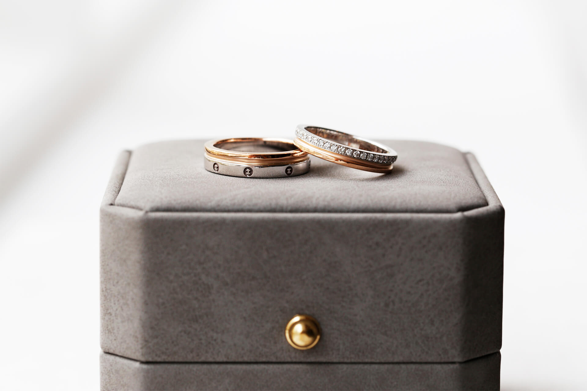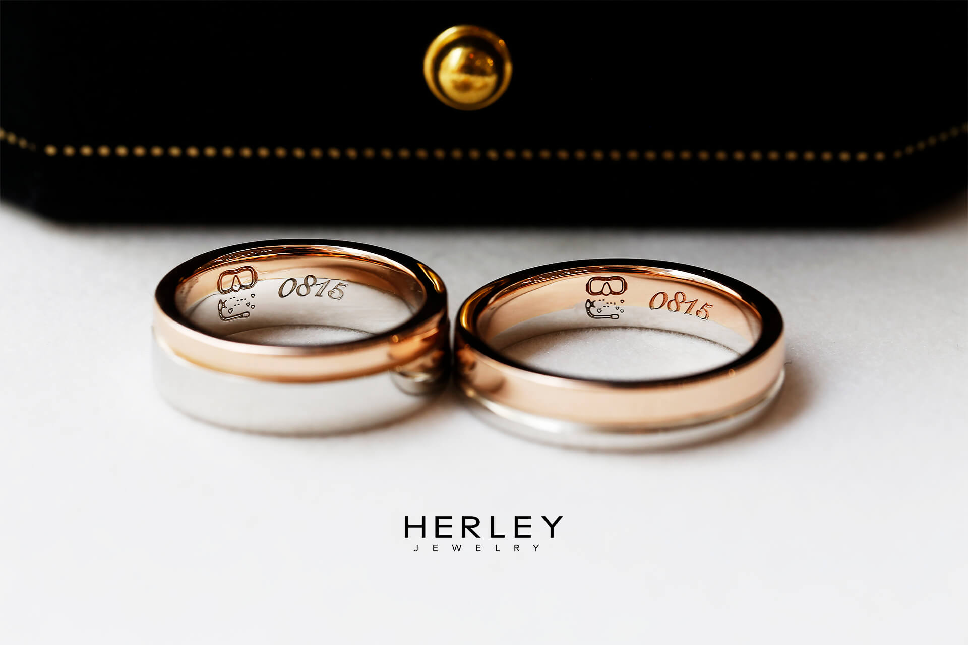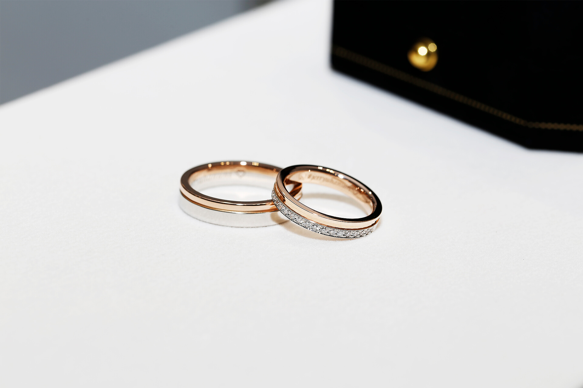 我們巧妙地運用雙色金屬,象徵著不同的你們。那一道恰到好處的間隔,如同兩顆緊密相依卻又保有自我空間的心,以最舒服的姿態相伴。
